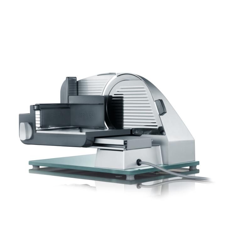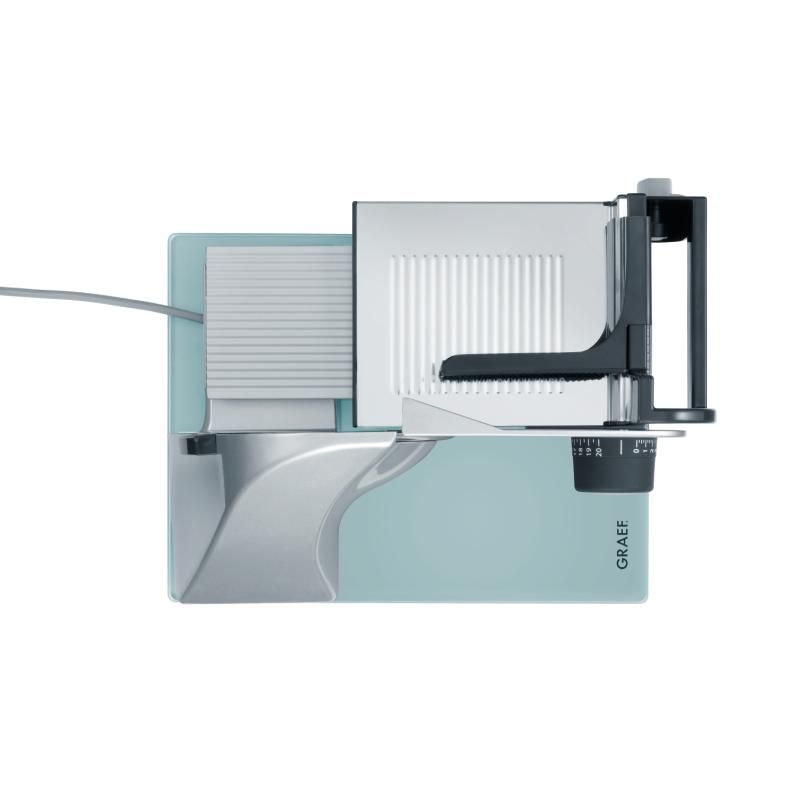 Graef Master er et suverent verktøy til alle kjøkken. Tykkelsen på skivene kan justeres manuelt fra 0-20mm på dreieknappen foran på maskinen. Maskinen har et helt stålskap som står på en solid glassplate.
