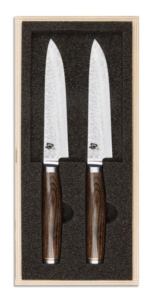 KAI SHUN PREMIER BiffknivsettKAI Shun Premier Biffknivsett. Den eksklusive knivserien KAI Shun Premier er svært vakker og er ment for den som stiller de aller høyeste krav til skarpe biffkniver når det kommer til, ytelse og design. Biffknivene er konstruert for å være lette og presise slik at man ikke blir sliten i hånden selv etter flere timers bruk. Bladet har en kjerne av VG-Max-stål samt 32 lags damaskstål med en vakker, hamret overflate. Ikke bare er overflaten svært lekker å se på, den gjør også at maten slipper lettere. Det ergonomisk utformede håndtaket i stilren, brun valnøttfarge er laget av svært holdbar kompositt som kalles PakkaWood. Biffkniven ligger godt i hånden og du har full kontroll. Passer både høyre- og venstrehendte. 60-61 HRC Rockwell. De skarpe biffknivene lages i Japan og er håndslipt.