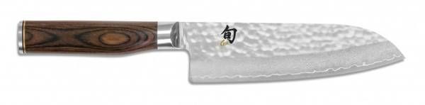 KAI Shun Premier Santoku, 18cm. Den eksklusive knivserien KAI Shun Premier er svrt vakker og er ment for den som stiller de aller hyeste krav til egenskaper, ytelse og design. Knivene er konstruert for vre lette og presise slik at man ikke blir sliten i hnden selv etter flere timers bruk. Bladet har en kjerne av VG-Max-stl samt 32 lags damaskusstl med en vakker, hamret overflate. Ikke bare er overflaten svrt lekker se p, den gjr ogs at maten slipper lettere. Det ergonomisk utformede hndtaket i stilren, brun valntt er laget av svrt holdbar kompositt som kalles PakkaWood. Kniven ligger godt i hnden og du har full kontroll. Passer bde hyre- og venstrehendte. 60-61 HRC Rockwell. Knivene lages i Japan og er hndslipt.