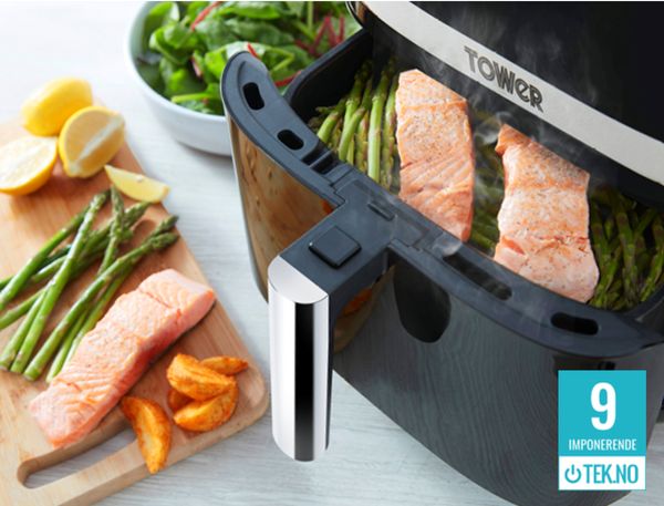 Tower 7L- Airfryer med stor skuff og damp.Tower introduserer denne fantastiske air fryeren med dampfunksjon!I én og samme maskin kan man nå tilberede alt fra saftig kylling, dampede grønnsaker og fisk, til herlig sprø bacon og pommes frites – eller hva med et saftig brød eller en fristende kake?Med denne kan du dampe, steke, bake, grille, varme opp, Combo-steame eller benytte varmluft.I tillegg til å være en tradisjonell air fryer kan du nå også lage sunnere mat raskere enn noen gang før, i én og samme maskin takket være dampfunksjonen.Maskinen leverer en rekke avanserte og nyttige funksjoner som du vil ha glede av hver dag. Alle betjenes med det digitale touch-panelet.Det unike Combo-Steam-programmet veksler mellom damp og luftsteking. Dette gjør at man får mat som er eksepsjonelt saftig på innsiden, men samtidig sprø og knasende på utsiden.En annen unik funksjon er Steam Clean som gjør rengjøringen til en lek. Med varm damp løsner tilnærmet alle matrester enkelt og helt uten bruk av kjemikalier.Vanntanken rommer 1,4 liter vann og gir over 100 minutter med kontinuerlig damping.Dette er maskinen for hele familien med en virkelig stor kurv som rommer hele 7 liter. Kurven er i tillegg avtagbar og belagt med Slipp-lett belegg for svært enkel rengjøring og gjør samtidig at du kan bruker minimalt med fett.Tower er Englands desidert største og mest populære produsent av airfryers og har fått 4,7 stjerner i best i testTemperaturområde 80-200 grader. Kurvstørrelse 30x37cm og 16cm høy.
