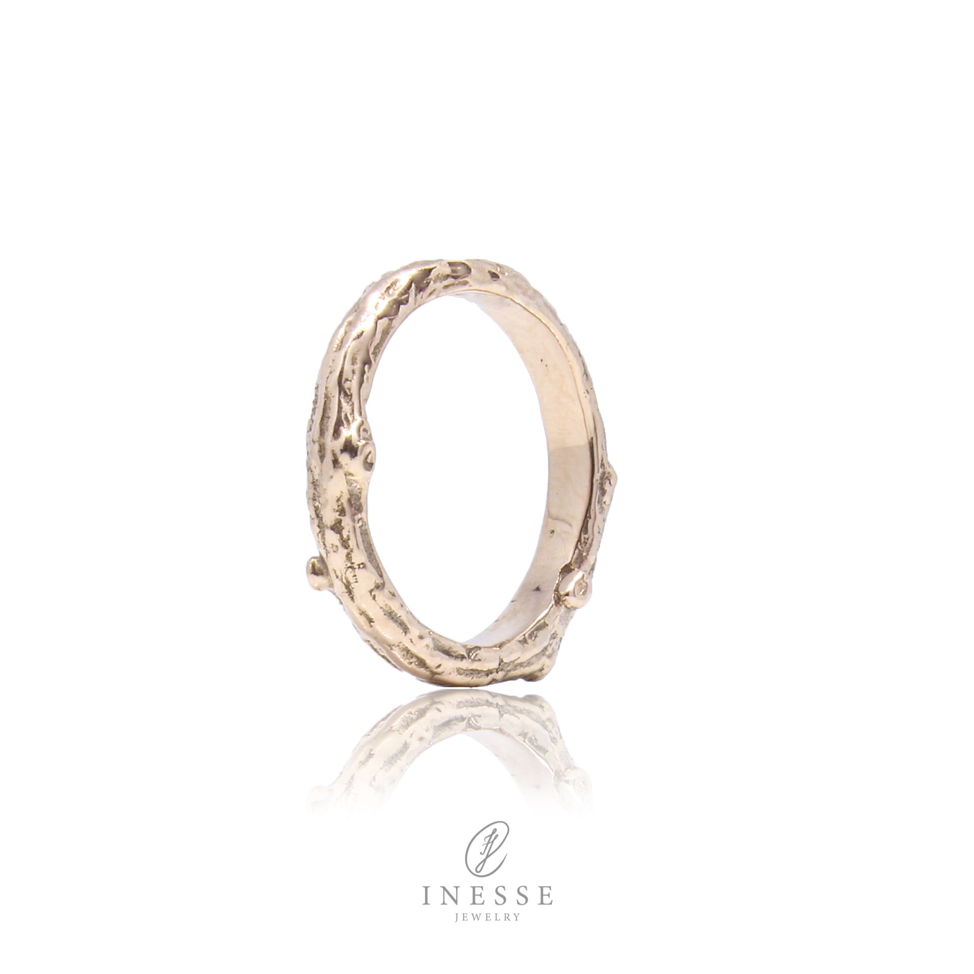Belen – naturinspirert ring i roségull med 0.015ct diamant – Naturlig Eleganse Belen – naturinspirert ring er en solid og unik ring, inspirert av den naturlige skjønnheten i kirsetreets grener. Det detaljerte relieffmønsteret er dypt og slitesterkt, designet for å vare livet ut. Ringen passer perfekt både til hverdags og fest. Den ser vakker ut alene, men fungerer også fint som sidering eller i kombinasjon med andre ringer. Hver ring er et kunstverk, håndlaget av en dyktig gullsmed, noe som gjør den helt unik. Ringskinnen i roségull har en bredde på 3 mm og har 0.015ct TW/SI diamant. Belen ring finnes også i hvitt, gult og roségull, med eller uten diamanter. Spesifikasjoner: Bredde: 3 mm Tykkelse: 1,5 mm Profil: oval Diamant: 0.015ct TW/SI Materiale: 14K gull (585) – velg mellom roségull, gult gull eller hvitt gull Bestilling og levering: Leveringstid: 7–14 arbeidsdager (kan variere i høytider). Haster det? Noen modeller kan sendes samme dag eller neste dag ved bestilling innen kl. 12. Ta kontakt for mer informasjon. Belen – naturinspirert ring i roségull med 0.015ct diamant – et tidløst og vakkert smykke. Ønsker du en unik, håndlaget ring fra en dyktig gullsmed? Utforsk flere produkter fra Inesse Jewelry . Belen – naturinspirert ring i roségull med 0.015ct diamant