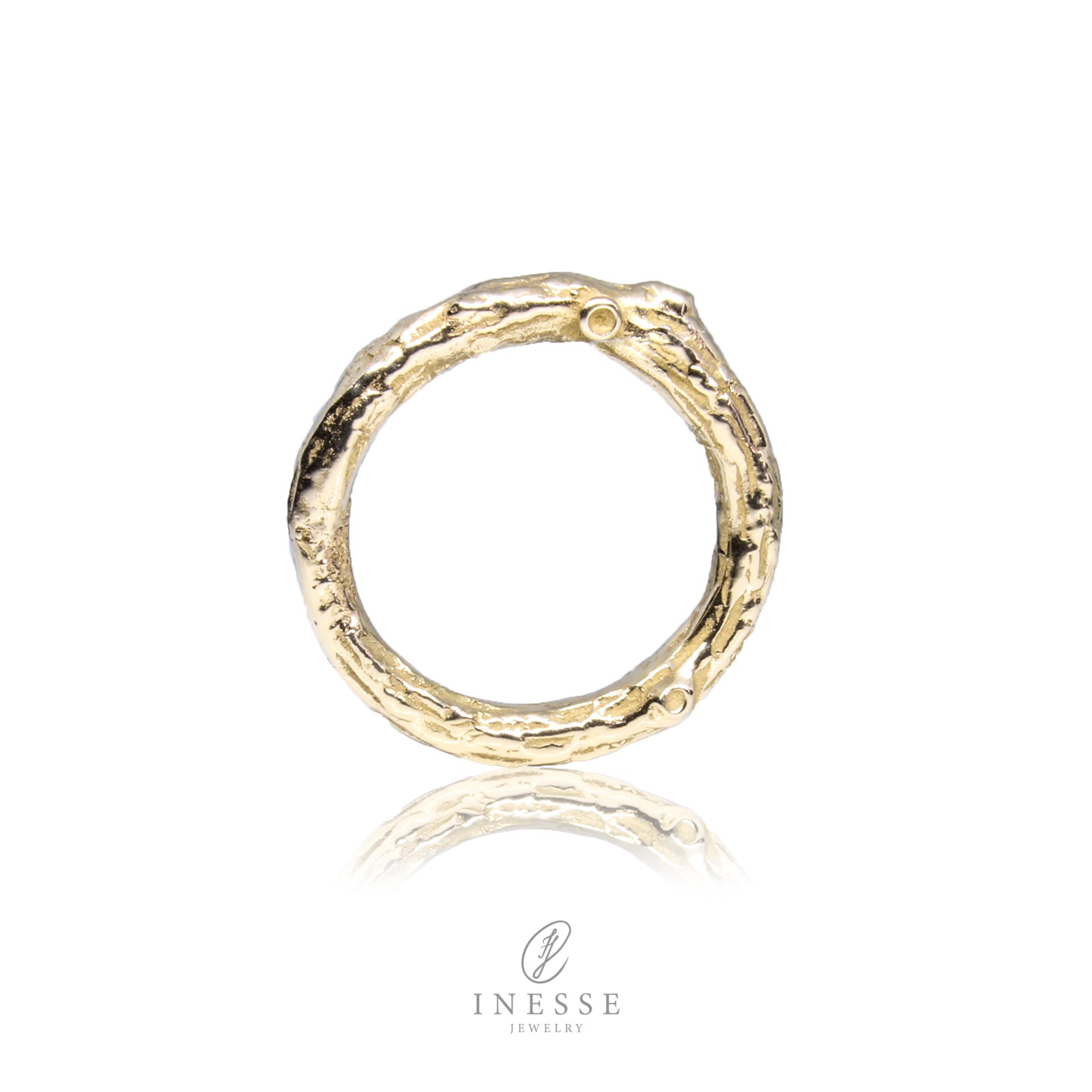 Kirsebærtre-gren gifteringen i gultgull med diamanter er en solid og unik ring, inspirert av den naturlige skjønnheten i kirsebærtreets grener. Det detaljerte relieffmønsteret er dypt og slitesterkt, designet for å vare livet ut. Ringen er skapt av designer Inesa og symboliserer et familietre eller et rede. På grenen plasseres det fire diamanter – én for hver av de viktigste personene i livet ditt. Ønsker du 1, 2, 3 eller 4 diamanter? Ta kontakt, så skreddersyr vi ringen etter dine ønsker. Hver ring er et kunstverk, håndlaget av en dyktig gullsmed, noe som gjør den helt unik. Ringskinnen i gultgull har en bredde på 3 mm med TW/SI diamanter 0,06ct. Kirsebærtre-gren ringen finnes også i hvitt, gult og roségull, med eller uten diamanter. Spesifikasjoner: Bredde: 3 mm Tykkelse: 2-2,5 mm Profil: rund-oval Stein: diamanter 0,06ct TW/SI Materiale: 14K gultgull (585) Bestilling og levering: Leveringstid: 7–14 arbeidsdager (kan variere i høytider). Haster det? Noen modeller kan sendes samme dag eller neste dag ved bestilling innen kl. 12. Ta kontakt for mer informasjon. Kirsebærtre-gren gifteringen i gultgull med diamanter – et tidløst og meningsfylt smykke som kan skreddersys etter dine ønsker. Ønsker du en unik, håndlaget ring fra en dyktig gullsmed? Utforsk flere produkter fra Inesse Jewelry. Kirsebærtre-gren gifteringen i gultgull med diamanter