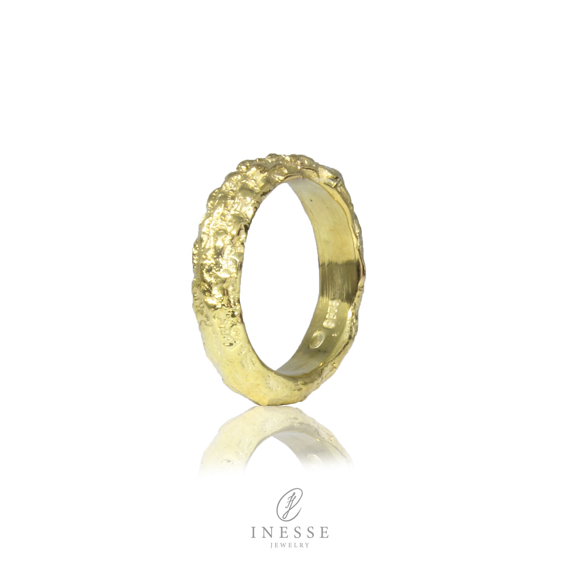 Furugren-ring i gultgull – Naturlig Eleganse Furugren-ring i gultgull er en solid og unik ring, inspirert av den naturlige skjønnheten i furutreets tykke grener. Det detaljerte relieffmønsteret er dypt og slitesterkt, designet for å vare livet ut. Ringen passer perfekt både til hverdags og fest. Den ser vakker ut alene, men fungerer også fint som sidering eller i kombinasjon med andre ringer. Hver ring er et kunstverk, håndlaget av en dyktig gullsmed, noe som gjør den helt unik. Ringskinnen i gultgull har en bredde på 5 mm og leveres uten diamant. Furugren-ring finnes også i hvitt, gult og roségull, med eller uten diamanter. Spesifikasjoner: Bredde: 5 mm Tykkelse: 1,5-2 mm Profil: oval Materiale: 14K gull (585) – velg mellom roségull, gult gull eller hvitt gull Bestilling og levering: Leveringstid: 7–14 arbeidsdager (kan variere i høytider). Haster det? Noen modeller kan sendes samme dag eller neste dag ved bestilling innen kl. 12. Ta kontakt for mer informasjon. Furugren-ring i gultgull – et tidløst og vakkert smykke. Ønsker du en unik, håndlaget ring fra en dyktig gullsmed? Utforsk flere produkter fra Inesse Jewelry . Furugren-ring i gultgull