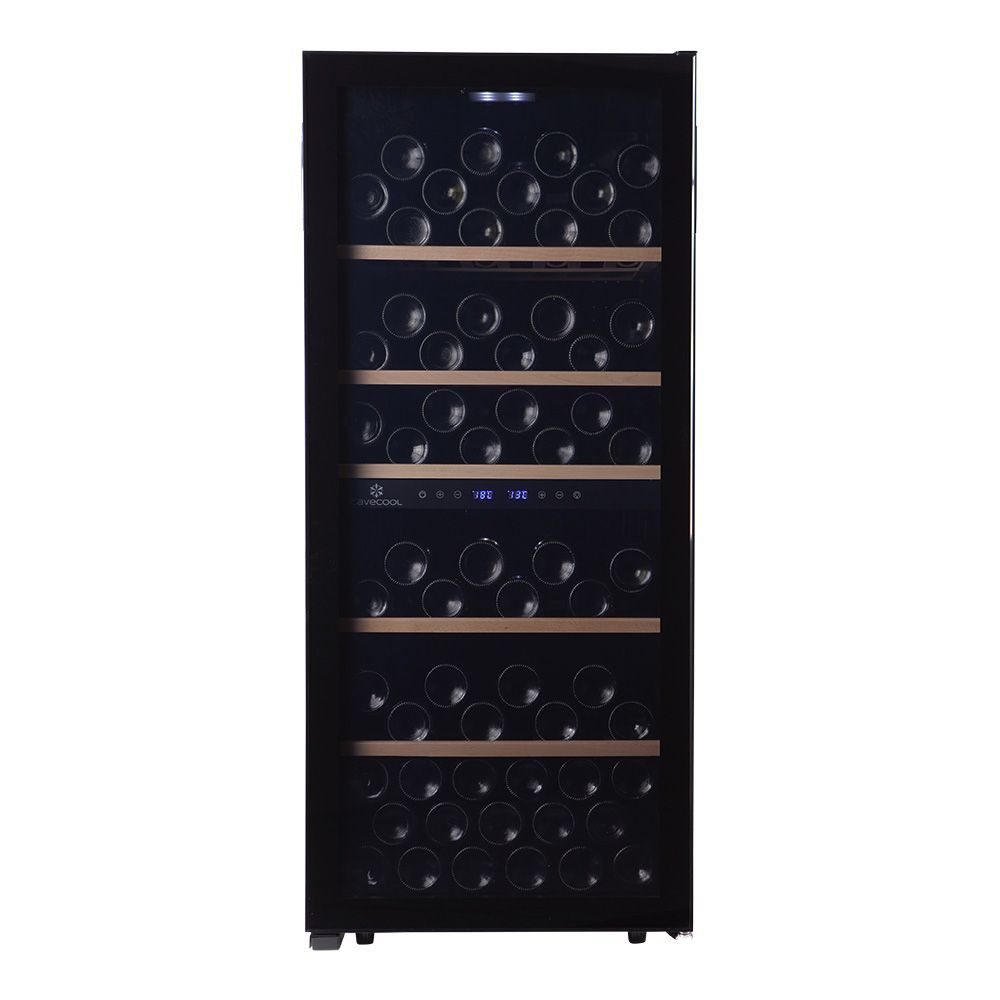 Cavecool Chill Sapphire: stilig vinskap med avansert funksjonalitet. To temperatursoner (5-12° og 12-18°), oppbevarer 102 flasker burgunder på 5 hyller i bøk. Bare 38 dB støynivå, fleksibel plassering i hjemmet.