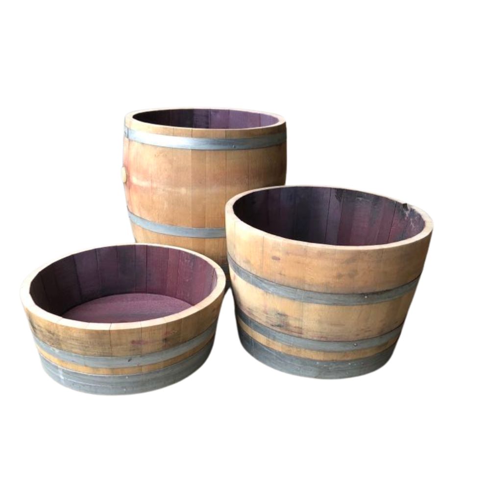 Forvandle hagen din med et 225-liters brukt fransk eikvinfat, perfekt for planteplassering eller som rustikt vannfremkomst. Holdbart og miljøvennlig.