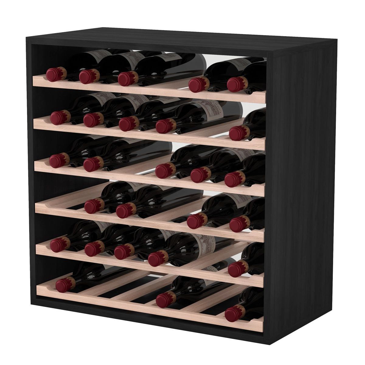 Modulen leveres montert og klar til bruk. Med 6 lekre uttrekkbare hyller er det plass til totalt 36 flasker av typene Bordeaux, Alsace og Burgundy.