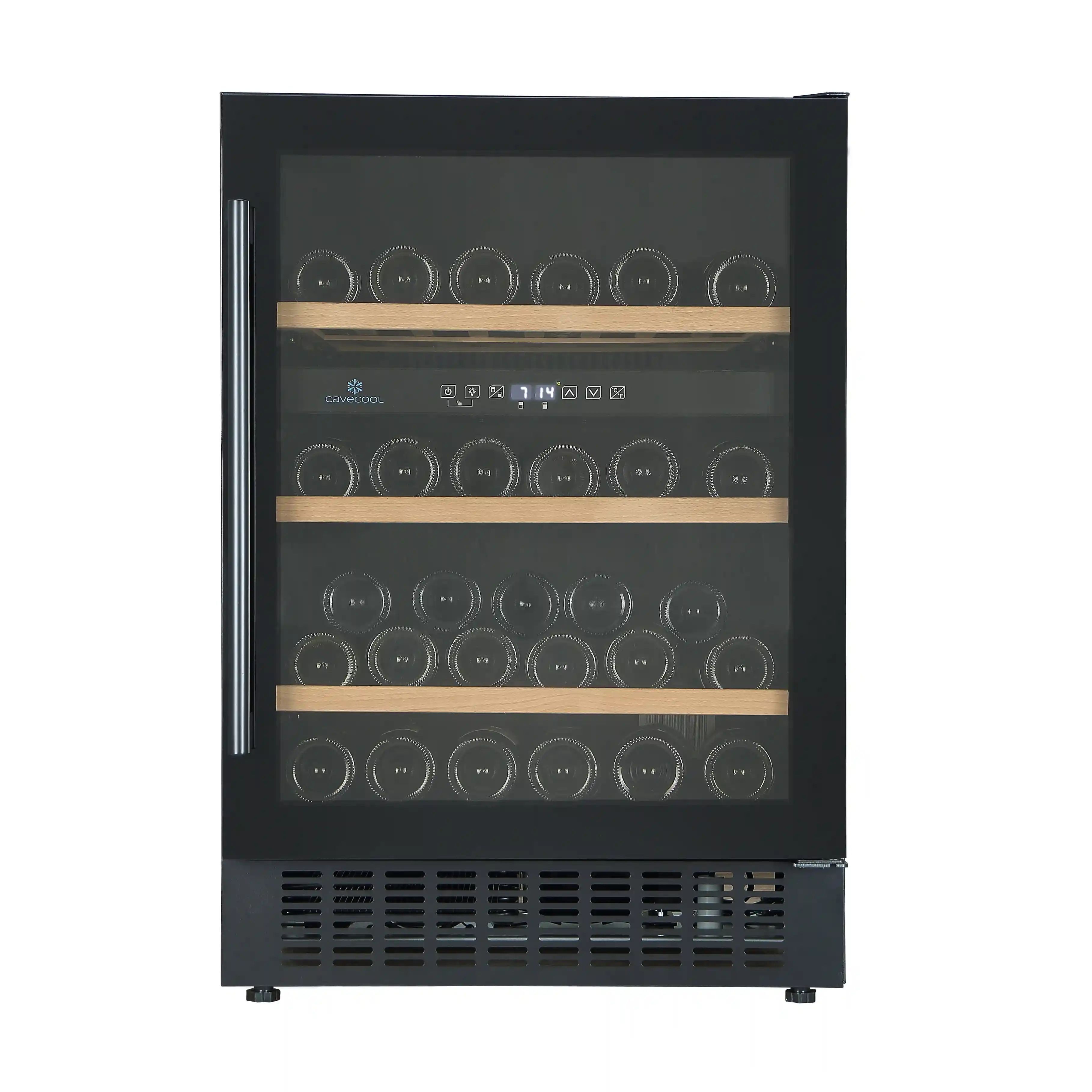 Cavecool Affection Jargon-Essential Edition: kompakt vinskap for 46 Bordeaux-flasker i to temperatursoner (5-22 °C). Bredde 59,5 cm, ideell for installasjon under benkeplaten. 3 hyller i bøk med hvitt LED-lys.