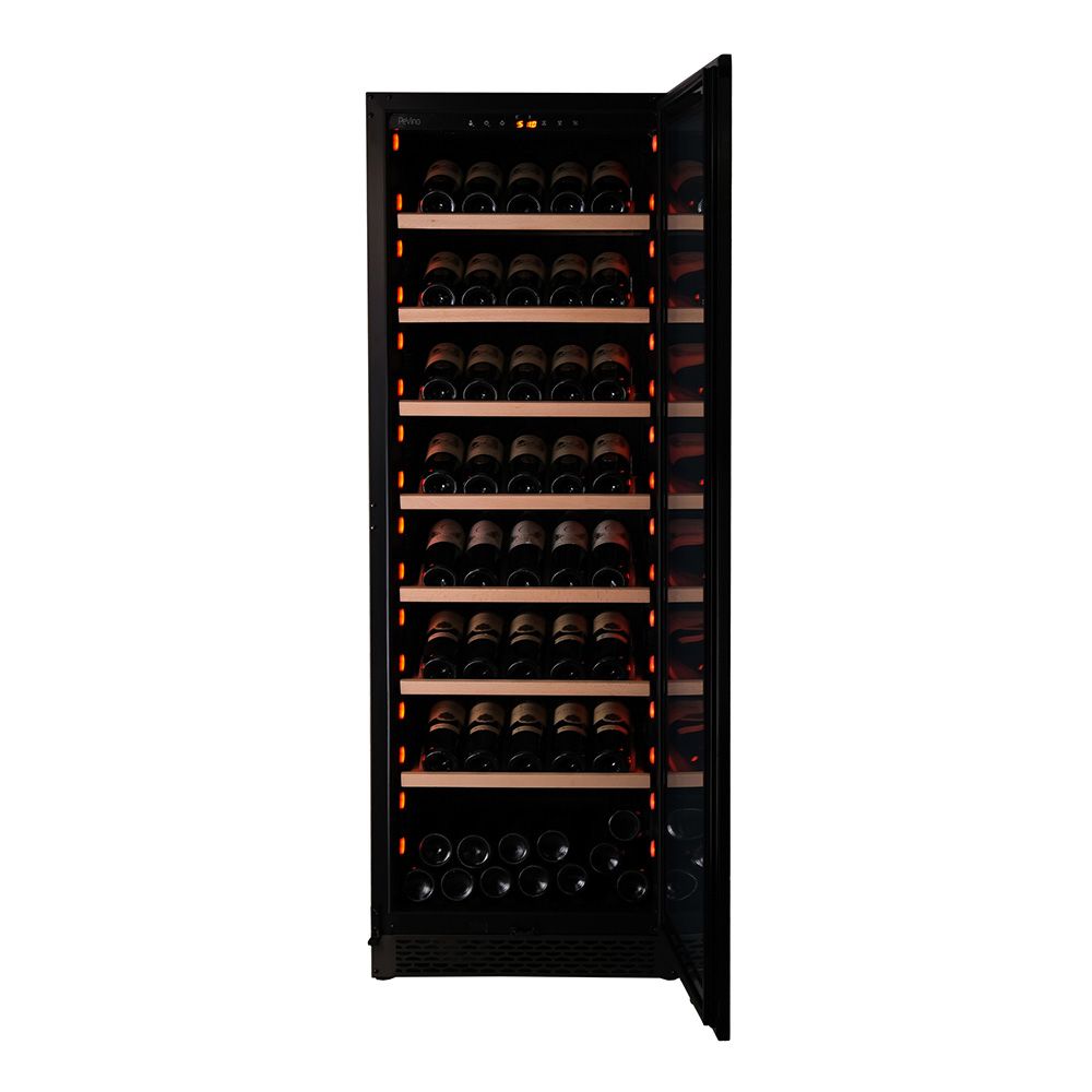 Pevino Majestic til 159 flasker er laget for lidenskapelige vinsamlere. Enkel sone (5-20 °C) med 7 fullt uttrekkbare hyller i bøk og LED-lys (hvitt, blått, oransje) for optimal oppbevaring og visuell appell.