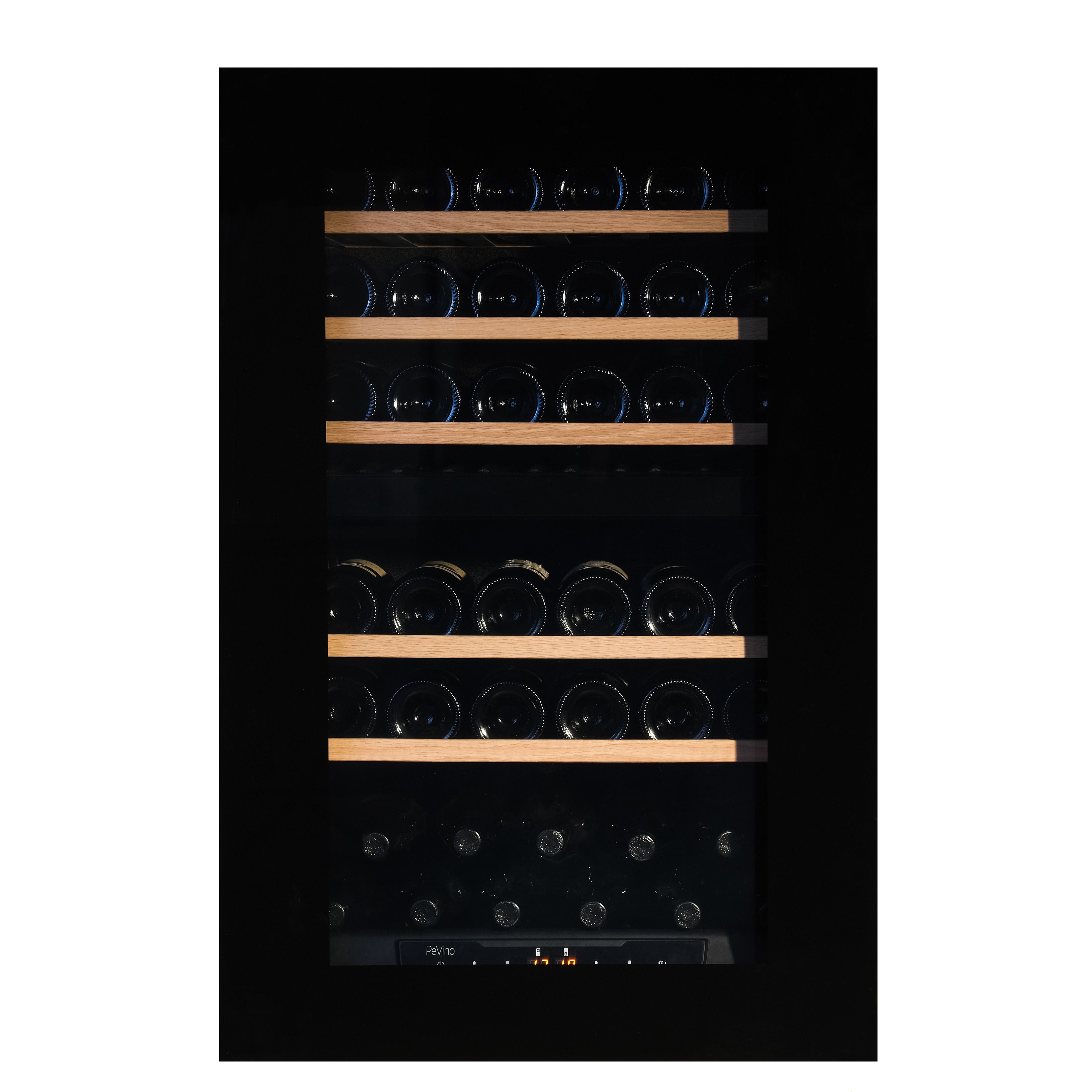 Pevino Majestic 42, et elegant vinskap med plass til 42 flasker i to soner. Inkl. 5 uttrekkbare eikehyller. Døren har en Push Open-funksjon som kombinerer funksjonalitet med stilig design.