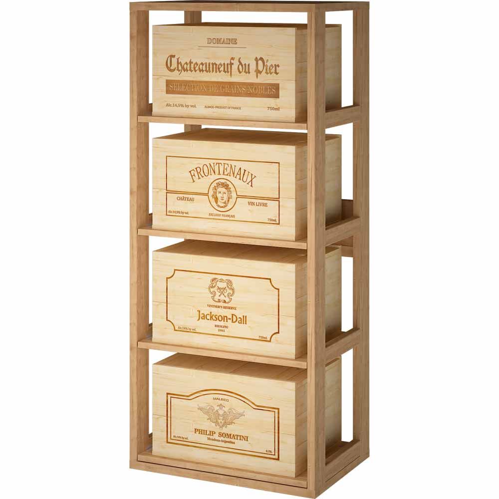 Winerex MARIA - 4 Kasser Winerex MARIA vinstativ tilbyr allsidig lagring med fire kasser, tilgjengelig i behandlet spansk furu, massiv eik og ulike fargede finisher. Mål: 44x32x105 cm (BxDxH). Leveres med justerbare føtter for optimal stabilitet.