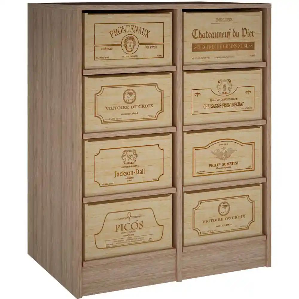 Winerex KASANDRA for 8 vinbokser (12 Flaskers Bokser) Elegant vinstativ tilgjengelig i behandlet spansk furu, massiv eik og ulike farger. Rommer opptil 8 x 12-flaskers eller 16 x 6-flaskers vinbokser. Mål: 82x64x105 cm (BxDxH). Justerbare føtter. Ideell for Bordeaux, Burgunder og Champagne-flasker.