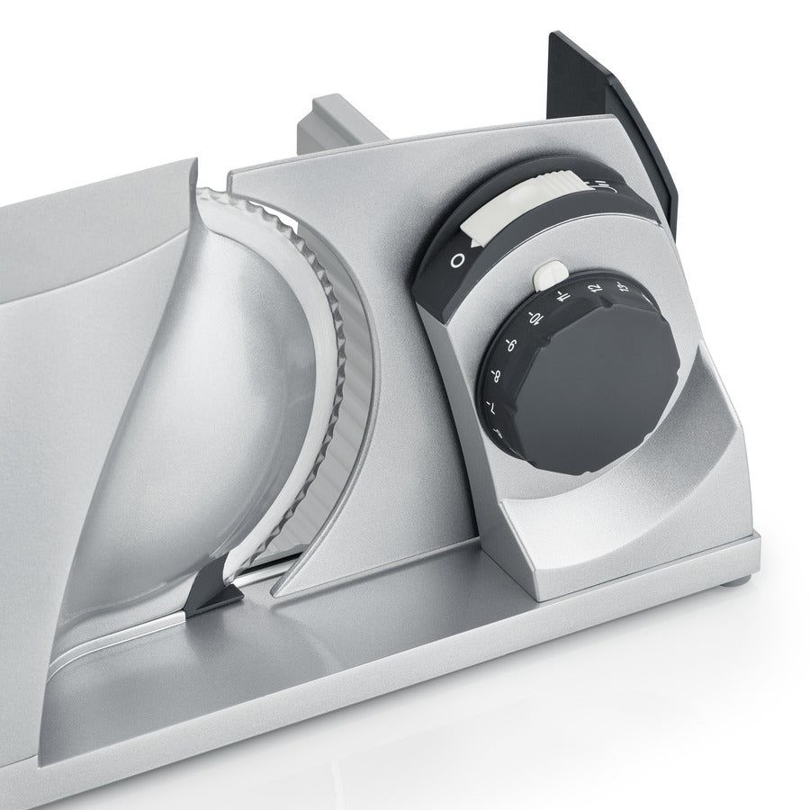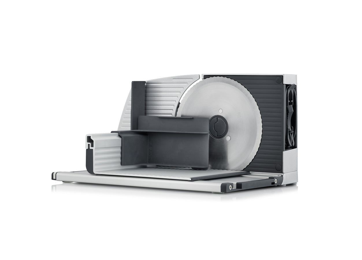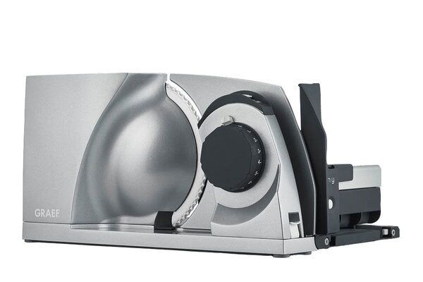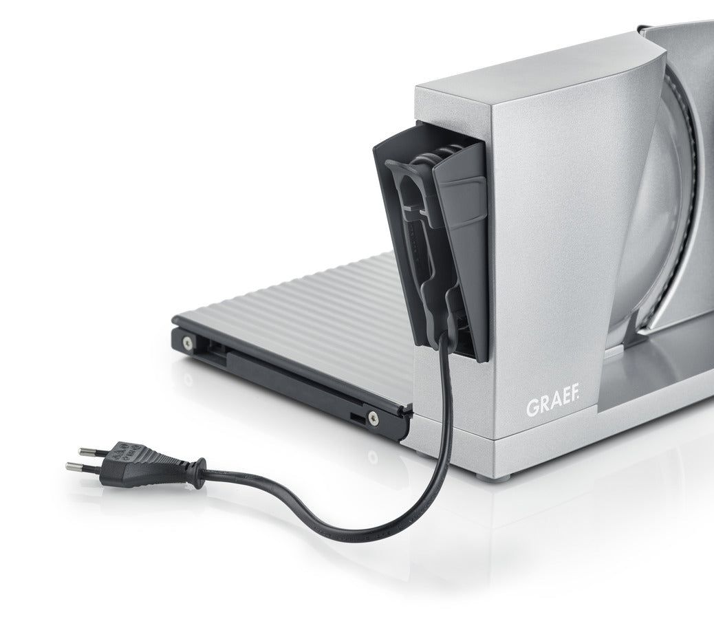 Graef Mytiny slicer i sølv er en sammenleggbar skjæremaskin utviklet for deg som ønsker kvalitet og effektivitet uten at det tar opp unødvendig plass. Den kompakte størrelsen, sammen med at den kan foldes, gjør at maskinen enkelt kan oppbevares i en kjøkkenskuff, et skap eller under benken. Maskinen er utstyrt med en 170 mm bølget kniv i maskinert rustfritt stål, ideell for presis kutting av både brød, ost og annet pålegg. Tykkelsen kan justeres fra 0 til 15 mm, og den betjenes med en dreieknapp som gir mulighet for både Quick-action og kontinuerlig drift. Den støysvake motoren yter normalt 45 watt, med en maks kapasitet på 170 watt når det trengs. Designet i elegant sølv gir et moderne uttrykk som passer godt inn på kjøkkenbenken dersom den ønskes stående fremme. Mytiny kombinerer tysk presisjon med fleksibilitet og er et praktisk valg for kjøkken i alle størrelser. 23,4 x 34 cm. Bare 8 cm tykk, sammenfoldet. Utsvingbar kabeloppruller og individuell justering av kabellengde Hurtig- og kontinuerlig betjeningsknapp Skjæretykkelse 0–15 mm Automatisk barnesikring Allsidig sagtannet kniv i rustfritt stål, Ø 170 mm Meget effektiv 45 W strømbesparende motor med 170 W maksimal skjæreeffekt og lav driftsstøy.