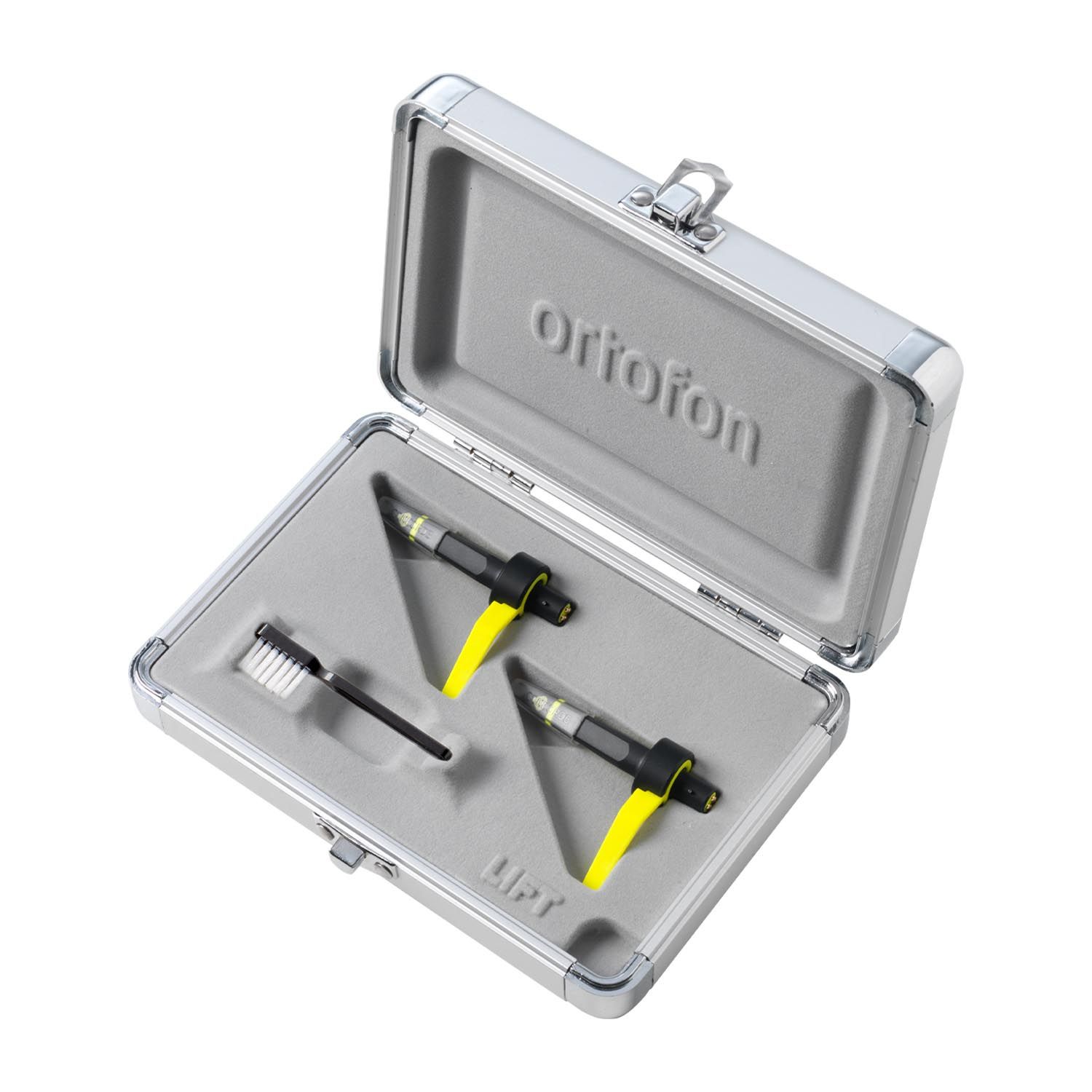 Sett med to seriøse Ortofon DJ-pickuper i en stilig mini-flightcase i aluminium.