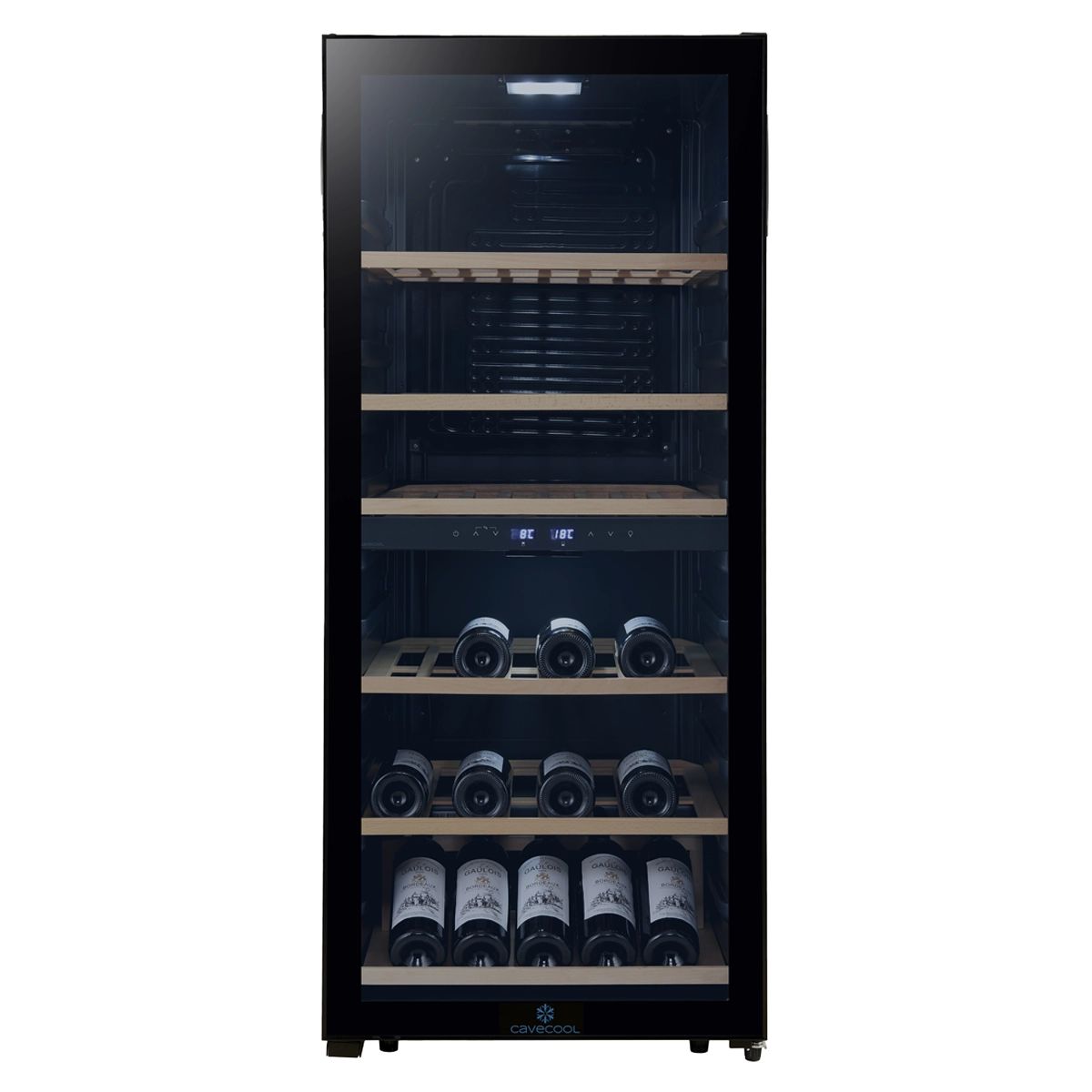 Oppbevar 102 flasker i 2 soner og med en elegant displayhylle i bunnen av skapet.