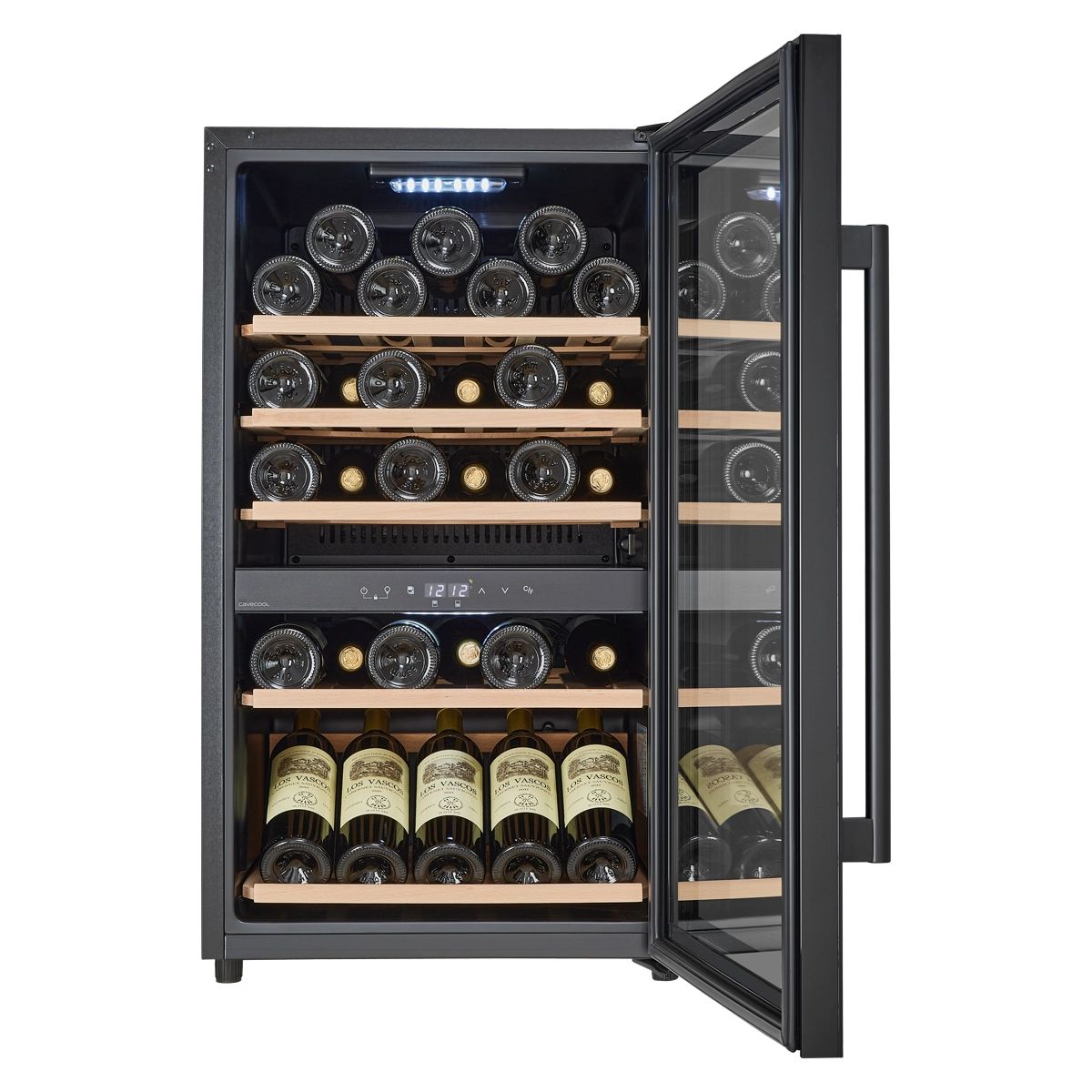 Oppbevar 49 flasker i 2 soner og med en elegant displayhylle i bunnen av skapet.
